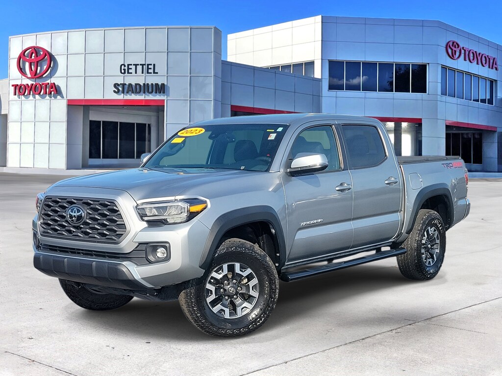 The ALL NEW Gettel Stadium Toyota is excited to offer this 2023 Toyota Tacoma TRD Off-Road in Celestial Silver with Cement Cloth. It features: **FAMILY OWNED & OPERATED DEALERSHIP**, **TOYOTA CERTIFIED**, *Apple CarPlay*, *Backup Camera*, *Bedliner*, *Bluetooth*, *Low Miles*, Lifetime battery replacement for all Toyota Certified Vehicles.
