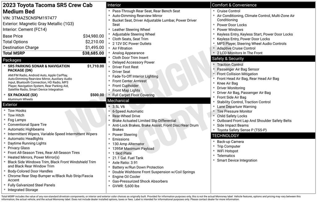 The ALL NEW Gettel Stadium Toyota is proud to offer this 2023 Toyota Tacoma SR5 in Gray with Cement Fabric (Fc) Cloth. It features:
