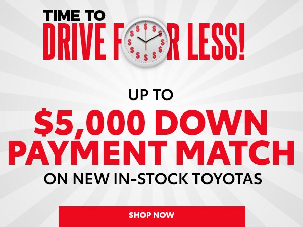 *Gettel Stadium Toyota will match the down payment provided by a client up to $5000 by offering a discount on the new Toyota TSRP. Not all new Toyota models will qualify. Must finance with dealer preferred lender. Must have approved credit, not all models or customers will qualify for offer. On select models only. Promotion must be mentioned with sales professionals before pricing is given. With approved credit. Interest accrues at date of purchase. On select models. Excludes $1299 dealer fee. Cannot be combined with other discounts. Example vehicle: 2026 Toyota Sequoia Capstone, model code 7955, TSRP $91,071. Promotion ends 2/28/2026.