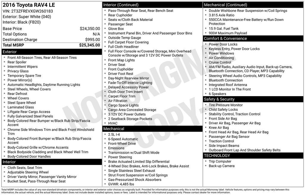 The ALL NEW Gettel Stadium Toyota is excited to offer this 2016 Toyota RAV4 LE in White with Black Cloth. It features: Prices are plus tax, tag, and title fee, and a pre-delivery service charge in the amount of $1,299.
