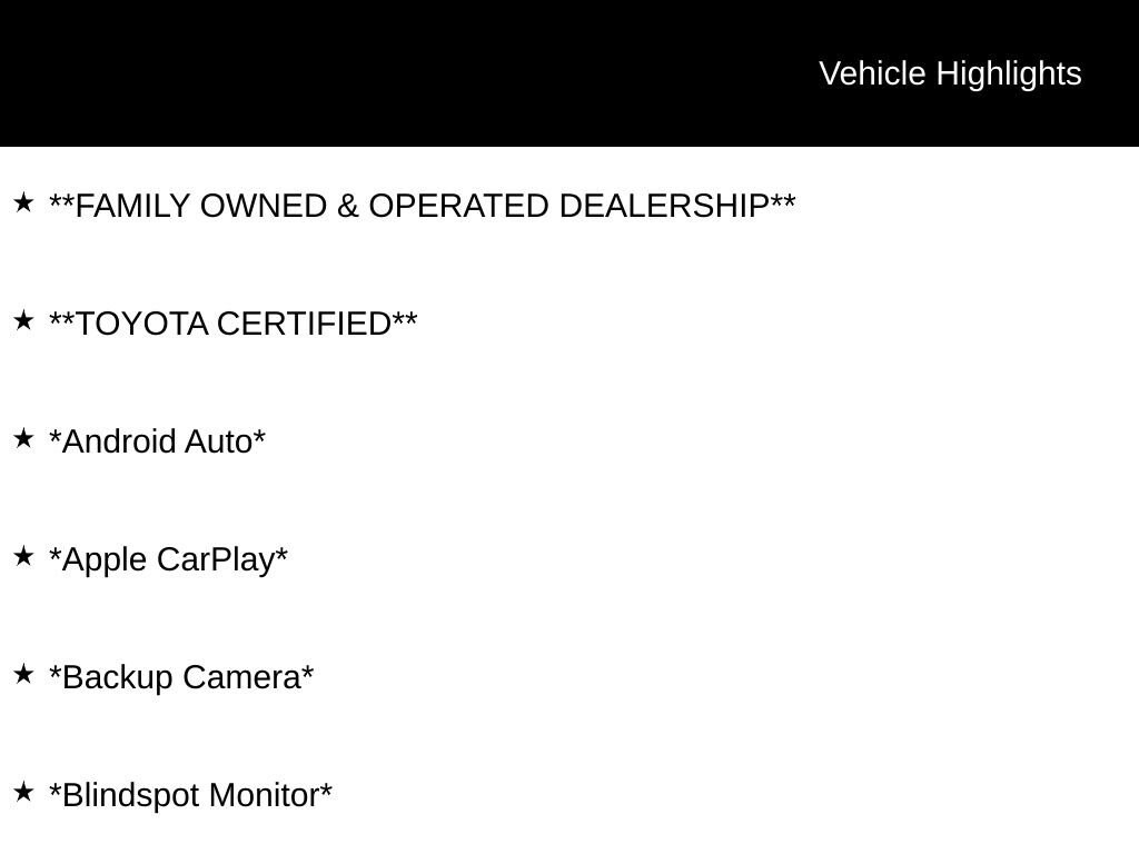 *Prices are PLUS tax, tag, title fee, $1,299 Pre-Delivery Service Fee** and $585 Electronic Tag Registration Service Fee** and dealer installed options (see dealer for details). A copy of the advertisement must be presented at time of purchase to receive any special or advertised price. Prior sales are excluded. We attempt to update this inventory regularly; however, there can be lag time between the sale of a vehicle and the updating of inventory. Vehicle information is based off standard equipment and may vary from vehicle to vehicle. Call or email for complete vehicle information. All specifications, prices and equipment are subject to change without notice. ** Fees/charges represents costs and profit to the dealer for items such as inspecting, cleaning, and adjusting vehicles, and preparing documents related to the sale.