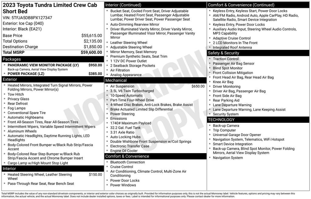 *Prices are PLUS tax, tag, title fee, $1,299 Pre-Delivery Service Fee** and $585 Electronic Tag Registration Service Fee** and dealer installed options (see dealer for details). A copy of the advertisement must be presented at time of purchase to receive any special or advertised price. Prior sales are excluded. We attempt to update this inventory regularly; however, there can be lag time between the sale of a vehicle and the updating of inventory. Vehicle information is based off standard equipment and may vary from vehicle to vehicle. Call or email for complete vehicle information. All specifications, prices and equipment are subject to change without notice. ** Fees/charges represents costs and profit to the dealer for items such as inspecting, cleaning, and adjusting vehicles, and preparing documents related to the sale.