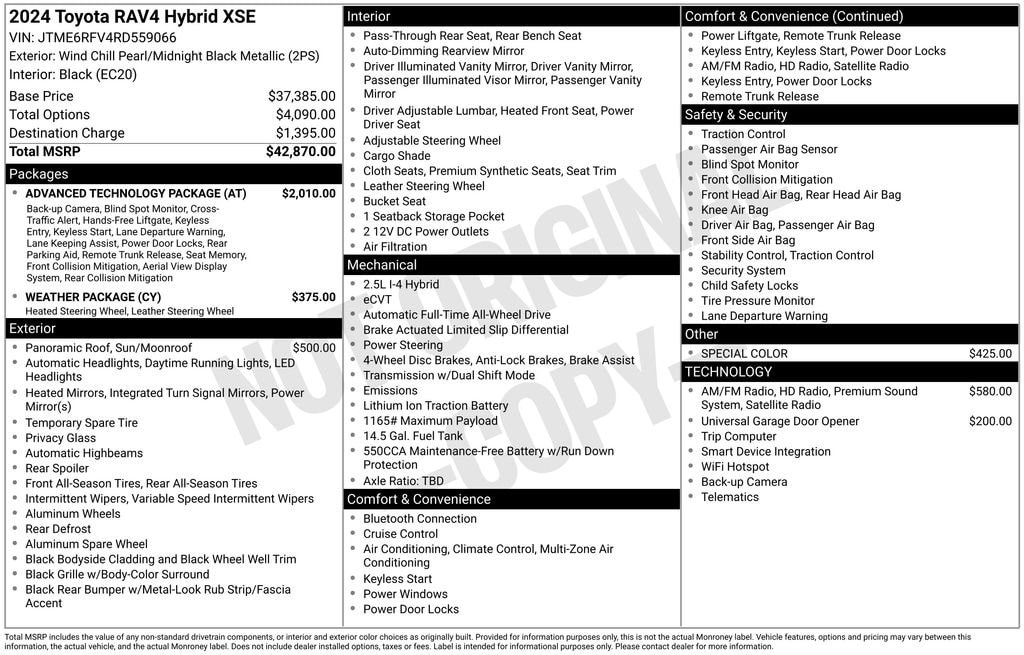 *Prices are PLUS tax, tag, title fee, $1,299 Pre-Delivery Service Fee** and $585 Electronic Tag Registration Service Fee** and dealer installed options (see dealer for details). A copy of the advertisement must be presented at time of purchase to receive any special or advertised price. Prior sales are excluded. We attempt to update this inventory regularly; however, there can be lag time between the sale of a vehicle and the updating of inventory. Vehicle information is based off standard equipment and may vary from vehicle to vehicle. Call or email for complete vehicle information. All specifications, prices and equipment are subject to change without notice. ** Fees/charges represents costs and profit to the dealer for items such as inspecting, cleaning, and adjusting vehicles, and preparing documents related to the sale.