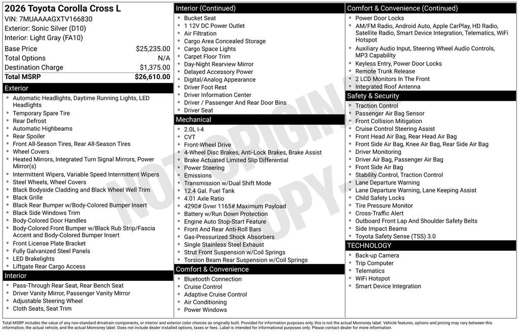 Under the hood, you'll find a powerful 2.0L I4 PDI DOHC 16V LEV3-SULEV30 engine that delivers an impressive 169 horsepower. Paired with a smooth-shifting CVT transmission and front-wheel drive, this Corolla Cross delivers an exceptional fuel economy of 31 MPG in the city and 33 MPG on the highway, making it both practical and efficient.