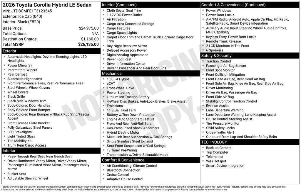 This Corolla Hybrid LE delivers an exceptional driving experience, boasting a 1.8L DOHC 16V VVT engine and eCVT transmission that achieves an impressive 50 MPG in the city and 43 MPG on the highway. Imagine the freedom of fewer stops at the pump and more time on the open road.